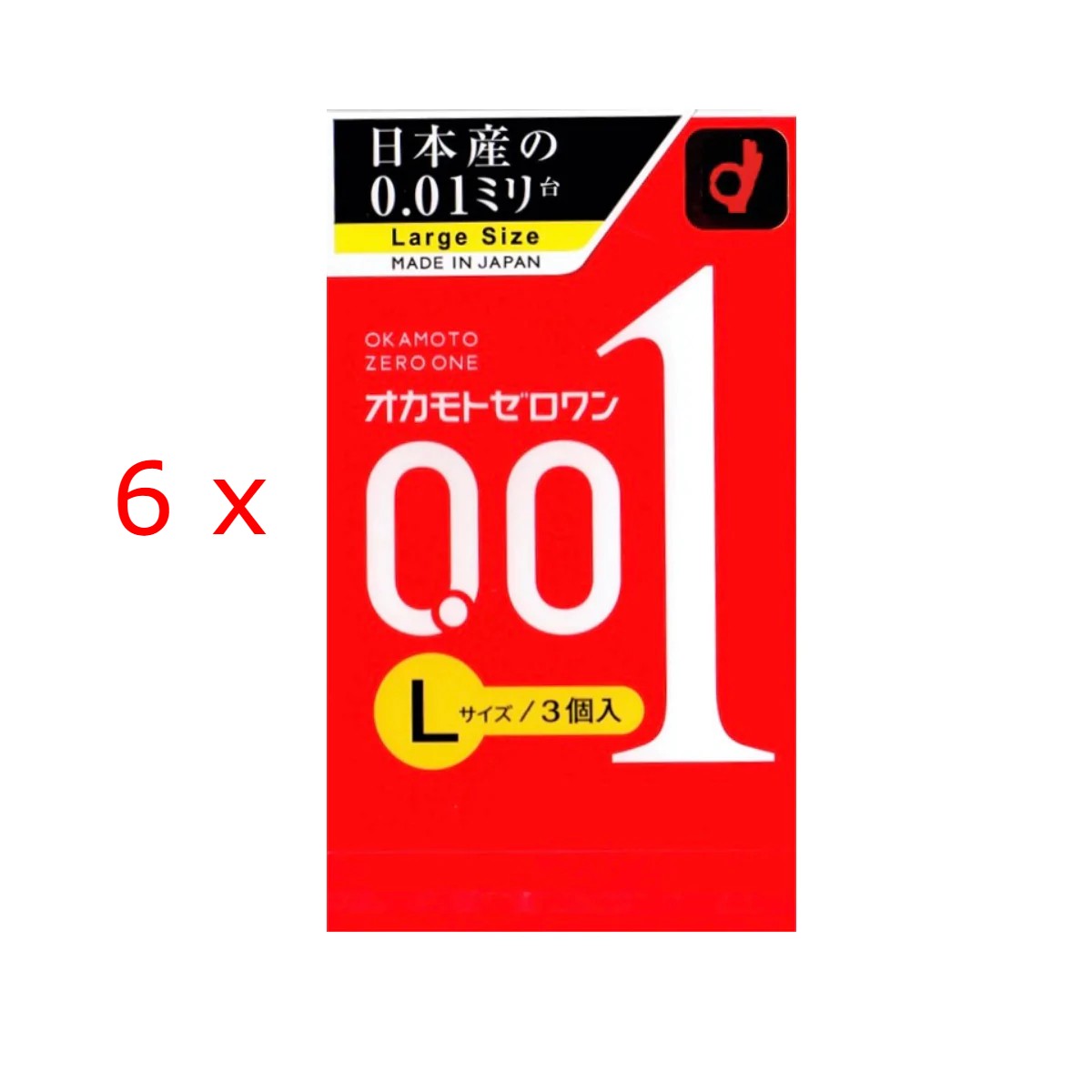 Okamoto Zero One 001 Large packs an extra punch in size as it remains the thinnest and sturdiest condom in the Okamoto range. Upsized and still one of the thinnest condoms in the world Safe to use non-latex polyurethane material Excitingly soft, elastic and hot sensation ensuring a raw feeling