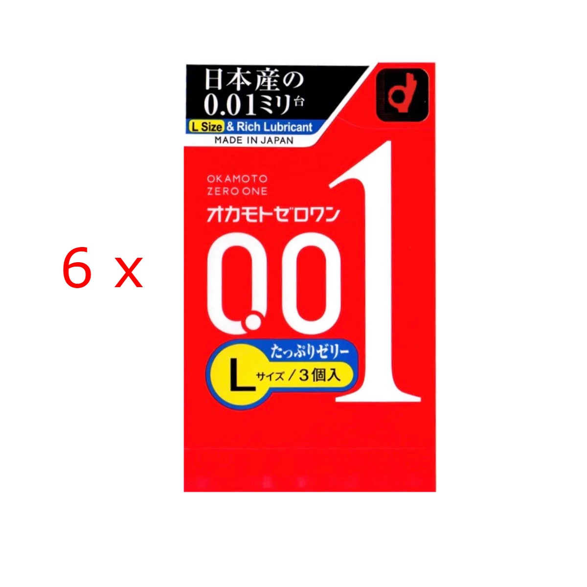 Okamoto Zero One 001 Large packs an extra punch in size as it remains the thinnest and sturdiest condom in the Okamoto range. Upsized and still one of the thinnest condoms in the world Safe to use non-latex polyurethane material Excitingly soft, elastic and hot sensation ensuring a raw feeling
